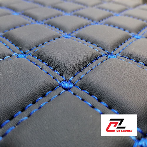 Da PVC Hình Vuông Nhẵn Đen Chỉ Xanh 2 Đường chỉ - B5 có bề mặt da Simili cao cấp, nhiều kiểu dáng hoa văn màu sắc dễ dàng phối hợp với màu nội thất xe. Do đó vải lót sàn 5D da PVC nhẵn chuyên dùng may thảm lót sàn xe hơi, bọc trần xe, bọc tappi,...