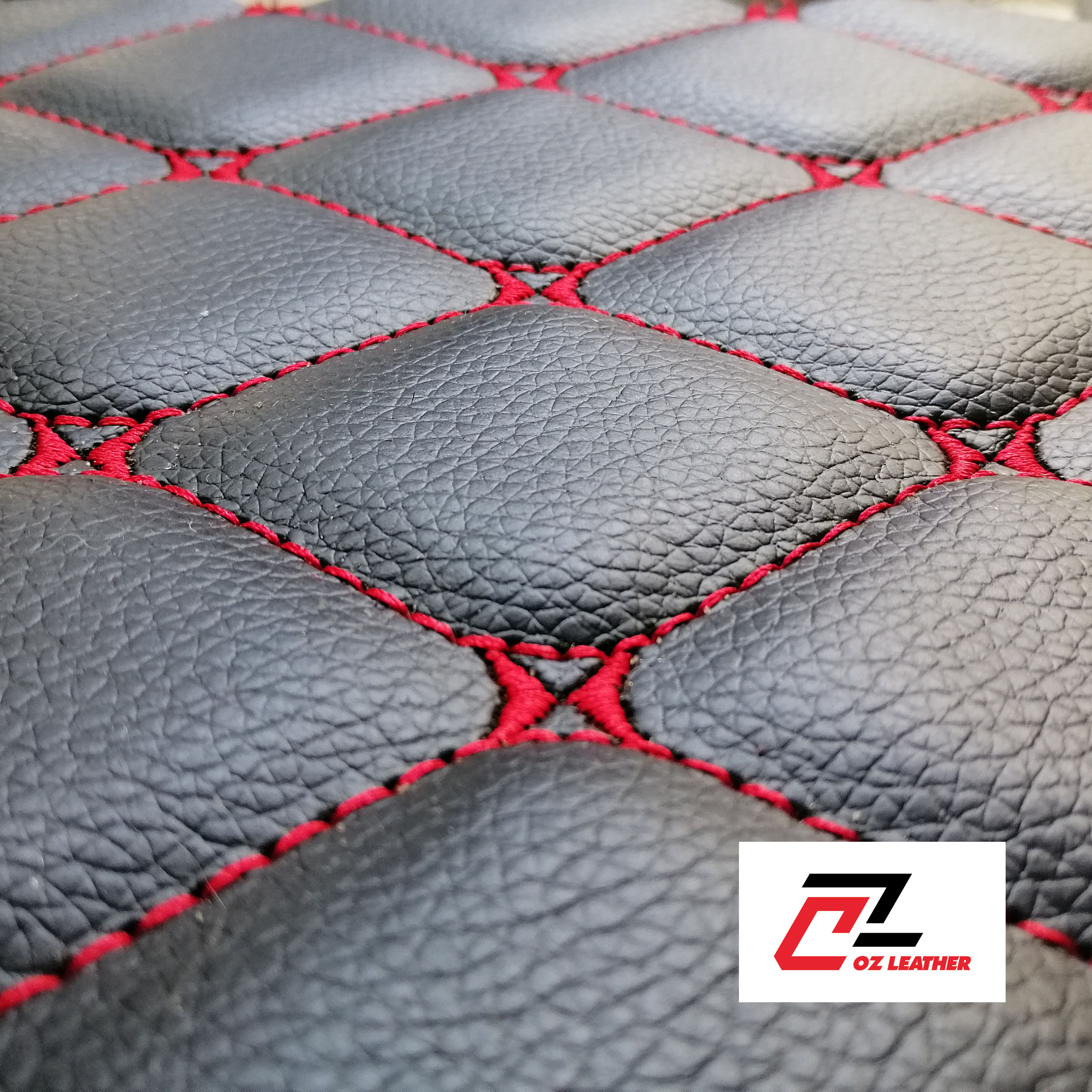Cận cảnh bề mặt lót sàn 5D Da PVC hình thoi sần đen chỉ đỏ - B11