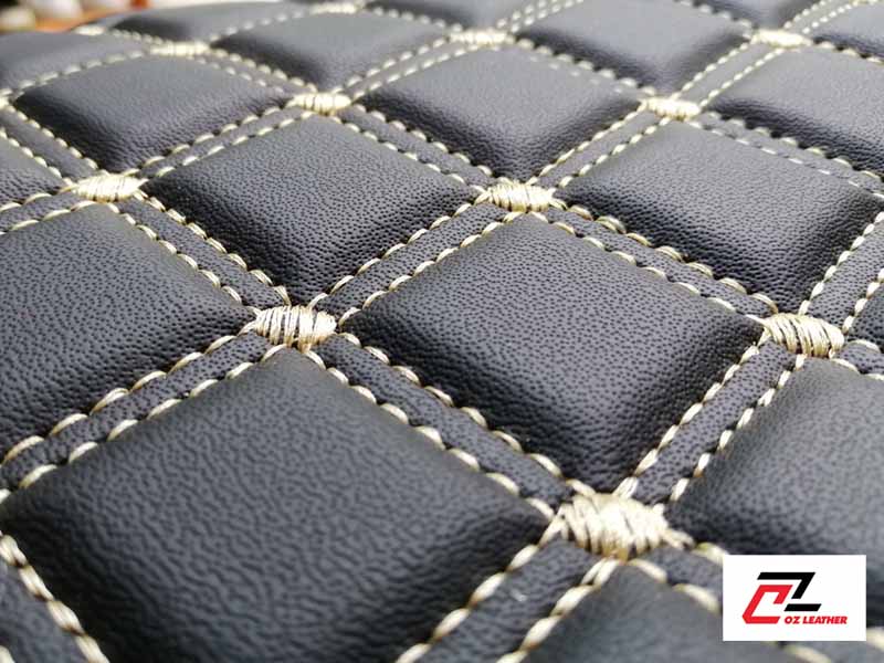 Vải ốp trần da Da PVC hình vuông sần đen chỉ kem 2 đường chỉ OZ leather dùng làm bọc trần, bọc tapi xe hơi, xe tải,...không sợ nấm mốc, không thấm nước, dễ vệ sinh góp phần làm sang trọng cho xế yêu của bạn.